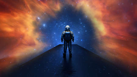 Astronaut cosmonaut stands on bridge of reflecting stars and looks into space, billions of stars and galaxies. Discovering new worlds. 3d render