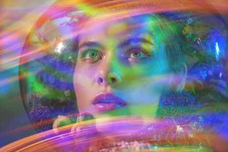 Close up portrait of a beautiful young woman in a spacesuit filled with flowers and green plants looking up at the space with hope. Environmental disaster, air pollution.