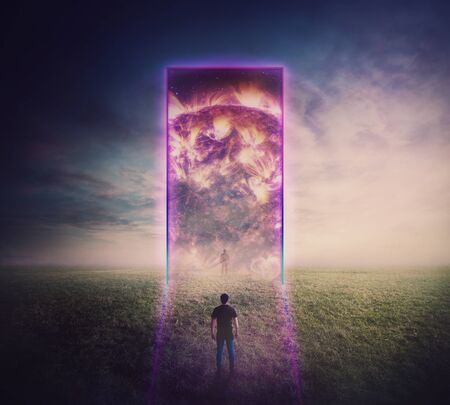A science fiction concept. A man standing in a field looking out across space with a glowing portal in the night sky