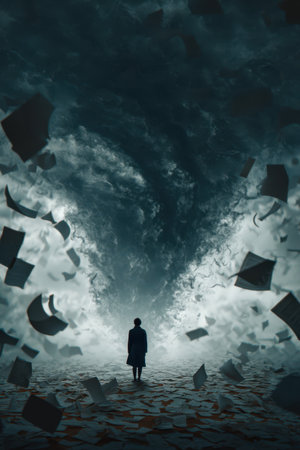 A person stands calmly as papers swirl in dramatic tornado, evoking surreal, intense atmosphere