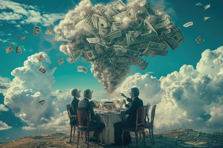 A diverse group of individuals sitting at a table, while money falls from above and onto the table, A surreal portrayal of financial success, AI Generated