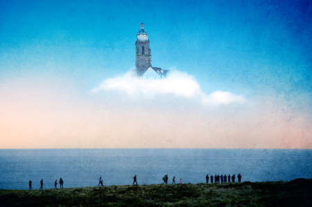 A magical concept. Of people looking at a tower floating in a cloud in the sky on a summers evening. With a grunge, artistic edit.
