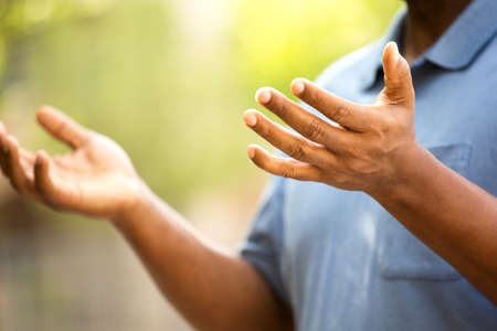 Close-up of hands of African-Ameican man raised against nature bavskground.