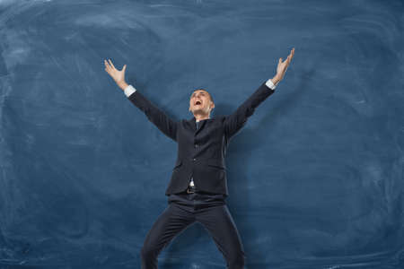 A businessman standing with splayed arms and shouting on the blue blackboard background. Bright and vivid emotions. The best in his field. Business development and the way to success. With great enthusiasm