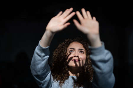 Portrait of young woman standing indoors against black bacground, playing with shadow.