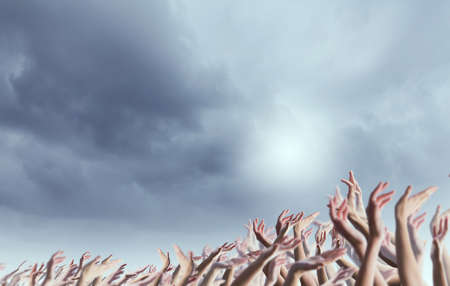 Crowd of people with hands raised up in to sky
