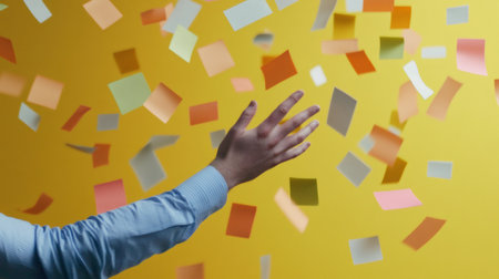 Hand reaching through a flurry of colorful sticky notes against a vibrant yellow background, symbolizing multitasking, stress, and time management challenges in a chaotic work setting