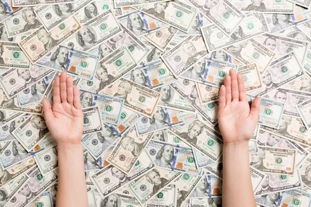 Top view of female hands on various dollar background. Wealth concept with empty space for your design. Begging money concept.