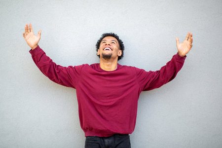 Young man with curly hair raising his arms joyfully against a gray wall
