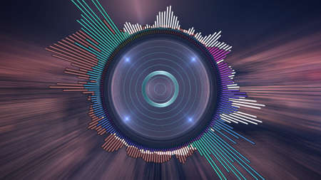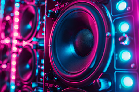 Sound audio speaker with neon lights on dark background. Dynamic monitor closeup. Creative backgroound