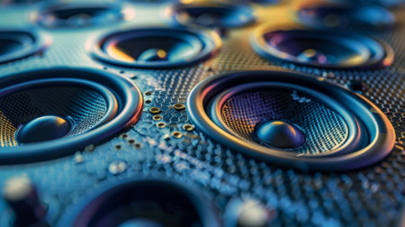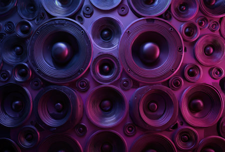 An array of speakers form a detailed, textured wall in this image. Circular shapes and dark tones dominate the composition. The lighting creates highlights and shadows across the surfaces. This abstract design could be used in various commercial projects related to sound and music.