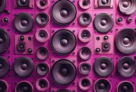 An array of speakers, varying in size, are arranged on a uniform pink surface. The composition features a repeating pattern of circular speaker designs, showcasing dark centers and tonal variations. This image could be suitable for music-related projects or used as a creative background, or for editorial purposes.