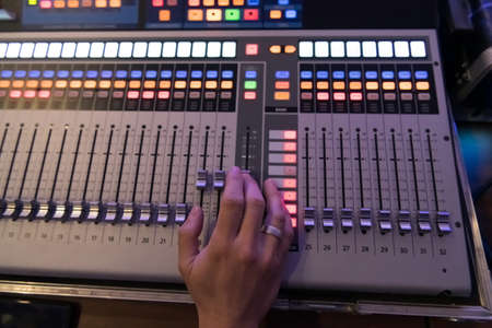 View of lighting engineer operator working on mixing console workplace during live event concert on stage show broadcast, light mixer controller panel, sound technician with professional equipment