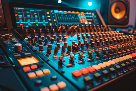 Modern mixing desk with glowing buttons and screens in a vibrant audio setup