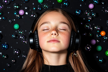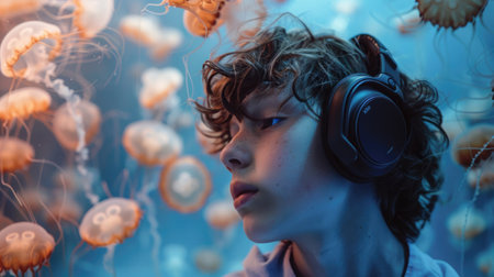 portrait of a teenager wearing headphones against the background of a painting with jellyfish