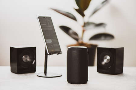 Black wireless portable speaker for music listening. Voice assistant speaker at home.