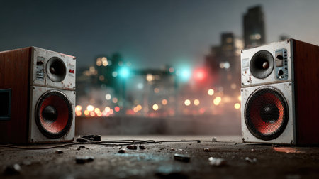 A captivating image of vintage speakers set on an urban street at night, surrounded by glowing city lights, creating a nostalgic atmosphere perfect for music lovers.
