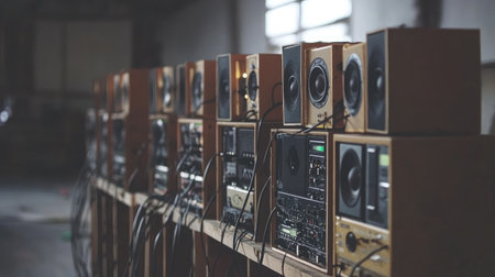 Different vintage audio speakers are creating a visually captivating wall, showcasing diverse designs and suggesting a powerful sound system for music enthusiasts and audiophiles