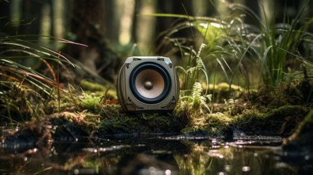 an outdoor sound speaker, reminiscent of fujifilm natura 1600, is positioned atop a surface. the image showcases vignetting and the forestpunk aesthetic, with the zeiss batis 18mm f2.8 lens capturing the essence of nature. earth tones are prominently featured, creating a junglepunk vibe. ai generated
