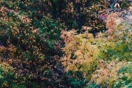 Autumn sunny nature background with multicolor foliage in golden sunshine. Full frame of wild thicket with yellow and red leaves in sunlight in fall time. Minimalist natural backdrop in autumn colors.