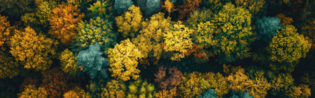 Aerial view of autumn forest. Top view of colorful trees in autumn forest.