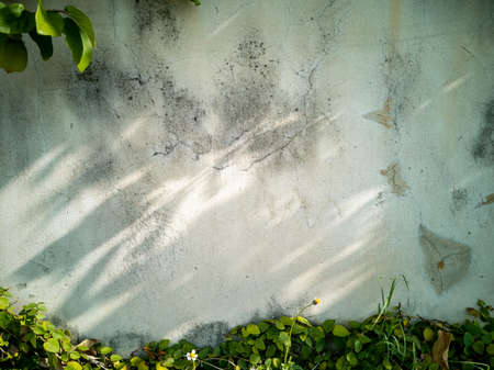 Green leaves and white concrete wall texture background. Copy space for text.