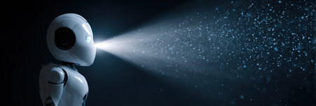 A futuristic robot shoots a shimmering light beam, creating a captivating effect in the dark.