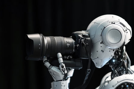Robot, artificial intelligence, takes pictures with a camera, the concept of Photographer Day. Header banner mockup with copy space. AI generated.