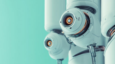 Close-up view of advanced robotic devices featuring spherical lenses and cooling pipes, set against a turquoise background to convey a sense of innovation.