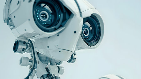 This setting features sleek white robots lined up highlighting intricate details of their technology in a stylish modern atmosphere.