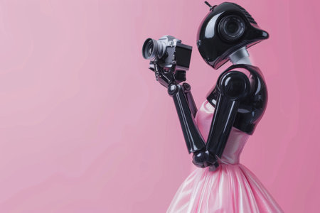 Woman robot in pink dress with camera and laptop, photostocker and freelancer working