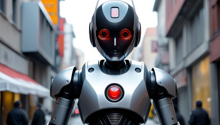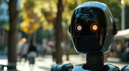 A sleek robot with red eyes and a shiny black and silver exterior walking in a busy urban street scene. AI Generation