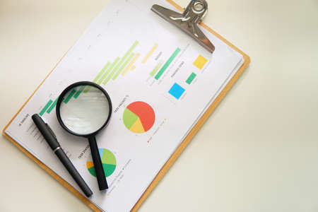 Financial Concept of Magnifying Glass, pen over a Statistic Graph Chart
