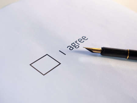 Check box OK on white sheet with pen for writing. Selective focus on the Agree box