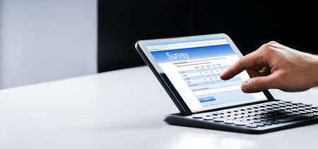 Close-up Of Human Hand Holding Digital Tablet With Online Survey Form
