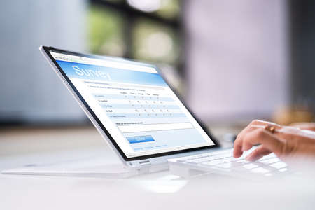 Close-up Of A Businessperson's Hand Filling Online Survey Form On Digital Laptop In Office
