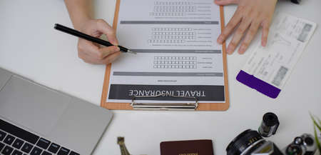 Top view of female travel preparing with fill out travel insurance form and looking informations on laptop