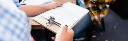 partial view of waiter holding clipboard with invoice near client, banner