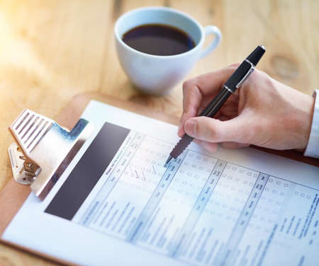 Close up of man hand filling form on a table at home or office