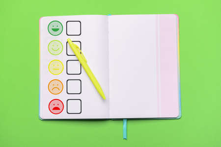Notebook with satisfaction rating and pen on green background