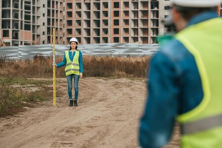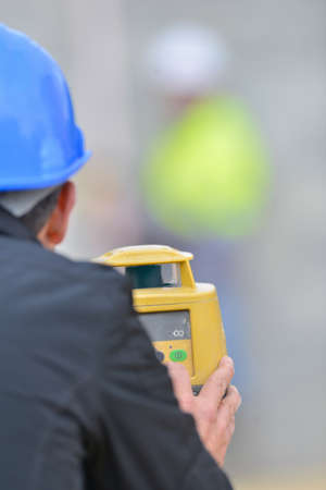 Professional engineer or land surveyor wearing hard hat and safety vest, using a measuring instrument at a building project