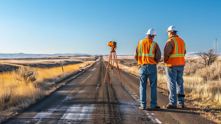 Professional land surveyor wearing hard hat and reflective vest, operating a total station for accurate measurements on a new road building site