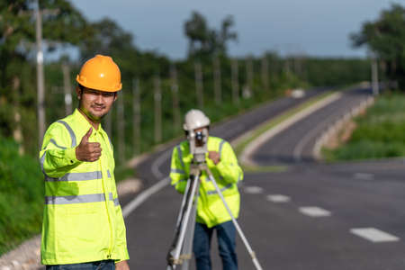 Asian happy surveyor engineers with digital level looking at camera on road construction site, Civil Engineers, Surveyor equipment.