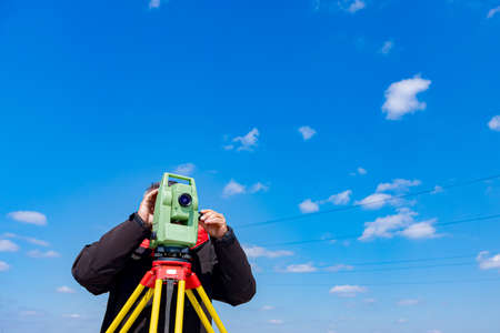 portrait of professional surveyor working with total station theodolite on landscaping project
