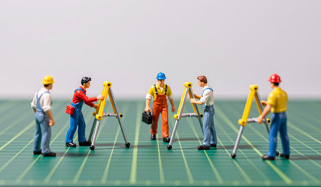 Six miniature figures gather around surveying equipment in a bright workspace. They are discussing plans and measurements, showcasing teamwork and creativity in a construction setting.