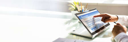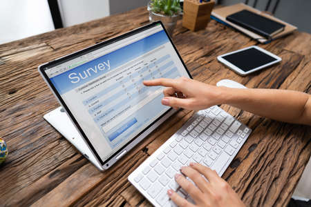 Close-up Of A Businessperson's Hand Filling Online Survey Form On Laptop
