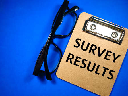Business concept.Text SURVEY RESULTS with glasses on blue background.