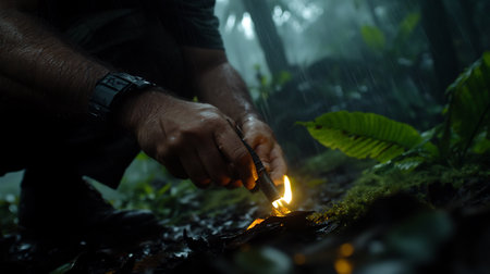 A man ignites a fire in a lush rainforest during a heavy downpour.