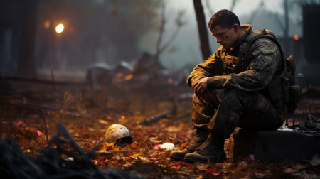 Portrait of a young soldier sitting on the ground in the rain