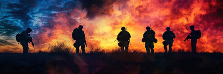 Silhouettes of soldiers on a sunset background. 3d rendering
